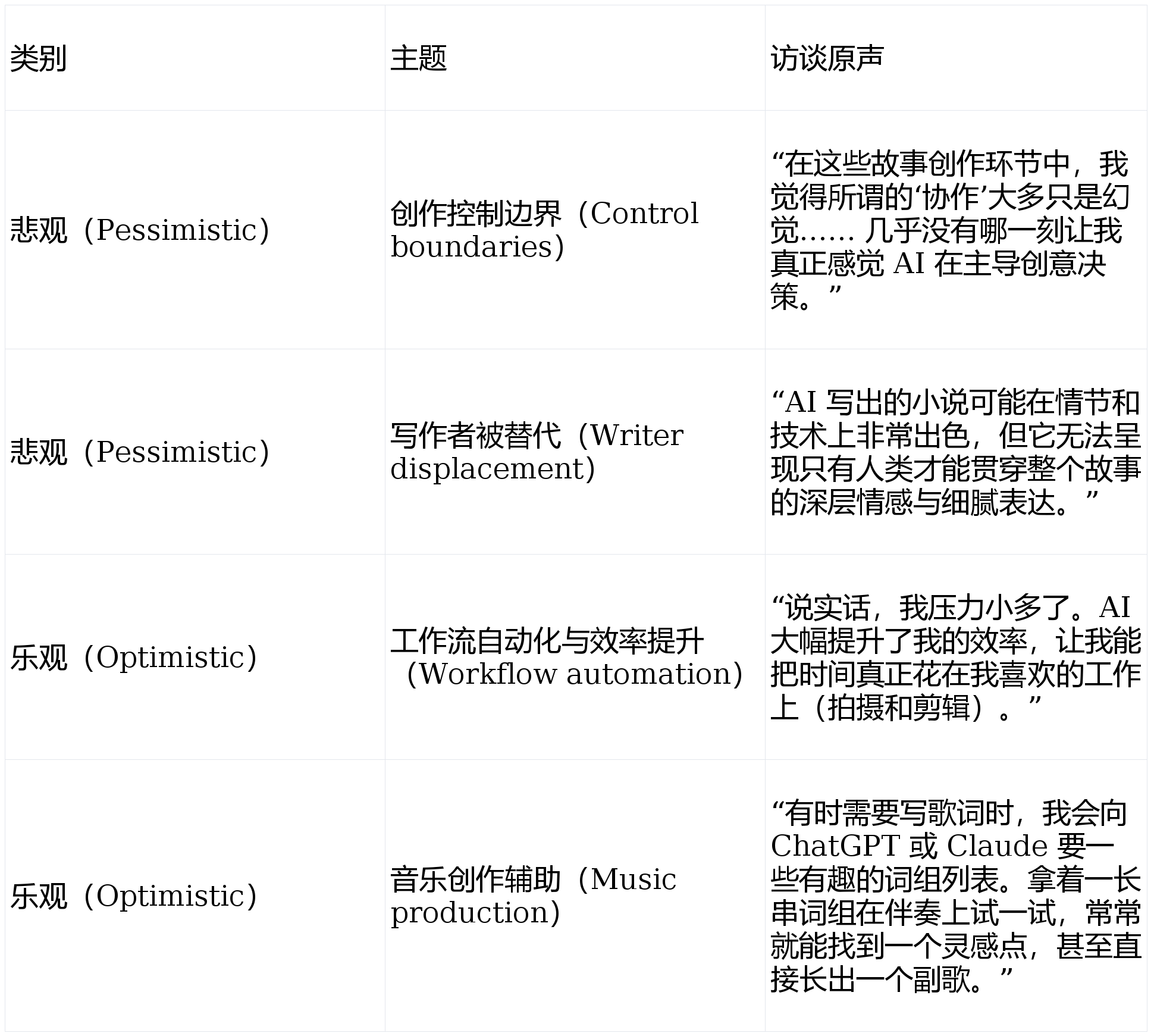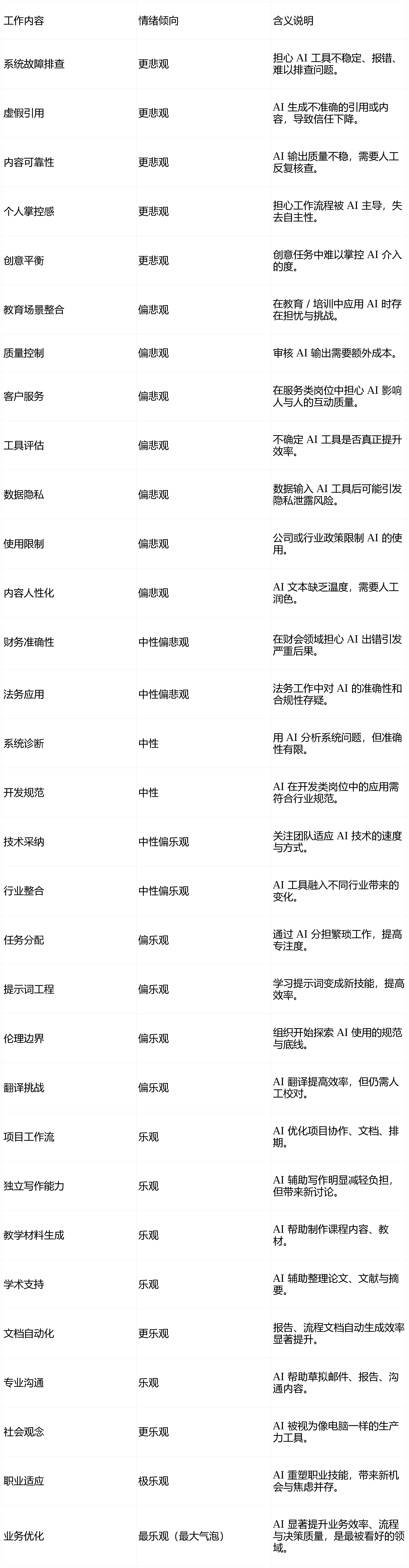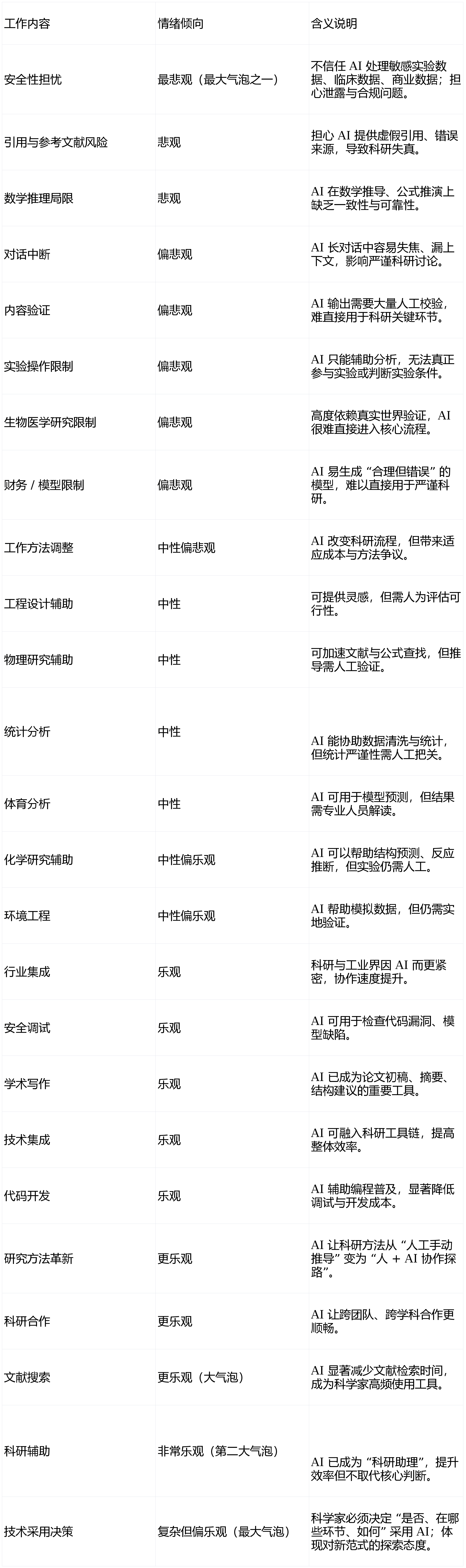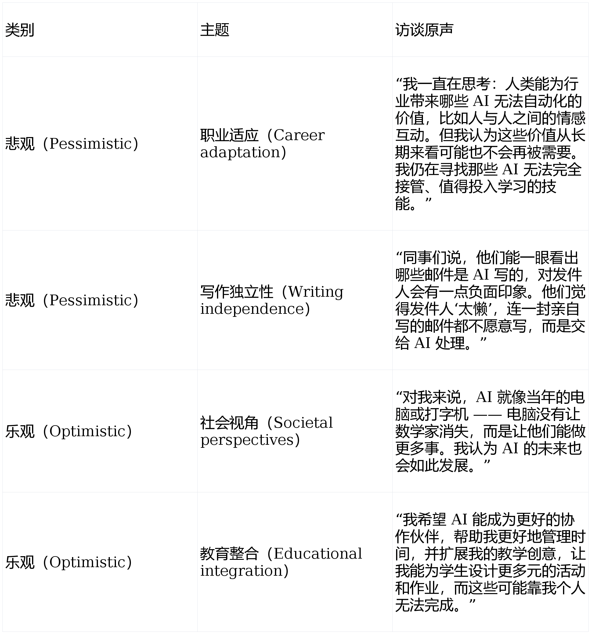 当AI采访了1250人,文本访谈难以捕获语气、脸色等感情线索;平安性担心是最凸起的悲不雅话题,三大群体的立场差别并非由手艺本身决定,而是对职业关系网中松动的担心。