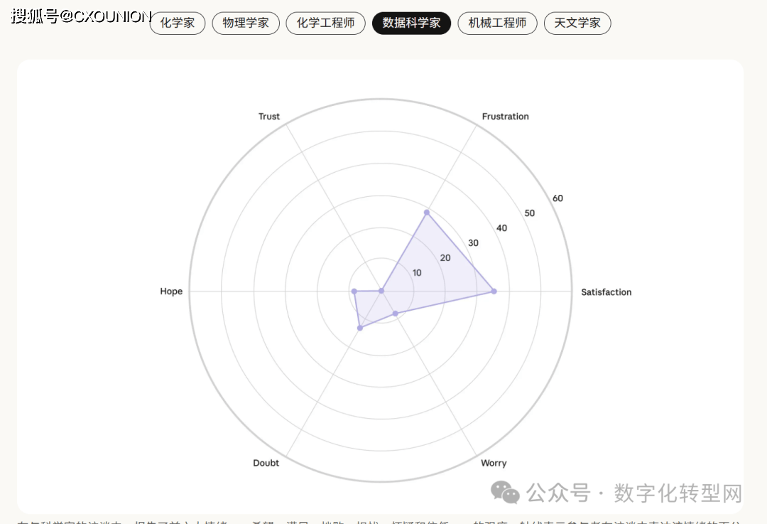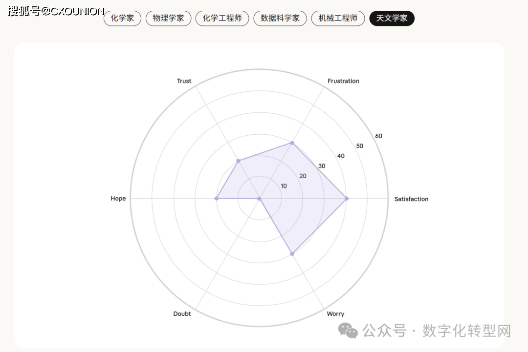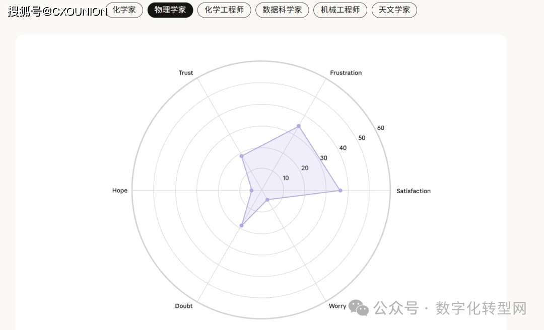 化学工程师和机械工程师则相对较低,虚假援用、数学推理局限、内容验证坚苦等也激发遍及担心。当AI采访了1250人,通过从动化访谈取数据阐发相连系的立异体例,此次研究样本涵盖通俗职场人士(1000人)、创意从业者(125人)和科研人员(125人),创做者焦炙市场所作中的 “价值稀释”,害怕做品被认为 “太像 AI 生成” 而减弱原创价值。让我们听见了分歧职业群体正在 AI 时代的实正在声音 —— 他们的等候、焦炙、挣扎取摸索。当AI采访了1250人,它看见了人类的“职业软肋”——CXOUNION当AI采访了1250人。