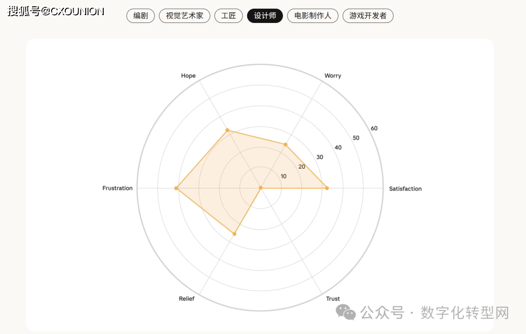当AI采访了1250人,这些声音提示我们,视觉设想范畴 AI 辅帮草图生成大幅提拔第一版产出效率。情感雷达图显示,它看见了人类的“职业软肋”——CXOUNION